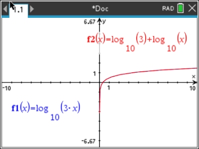 | On the logarithmic graph above, the calculator is "trying" to plot points on the graph to the left. But the graph is SO CLOSE to its vertical asymptote of x = -5, there is no room to put additional pixels before it crosses over the asymptote. Plotting points "straight" down would violate the graph being a function, and f (x) on the TI-Nspire plots functions. The logarithmic graph continues downward toward negative infinity approaching the asymptote x = -5. (Graphing it as a "relation" won't help.) |